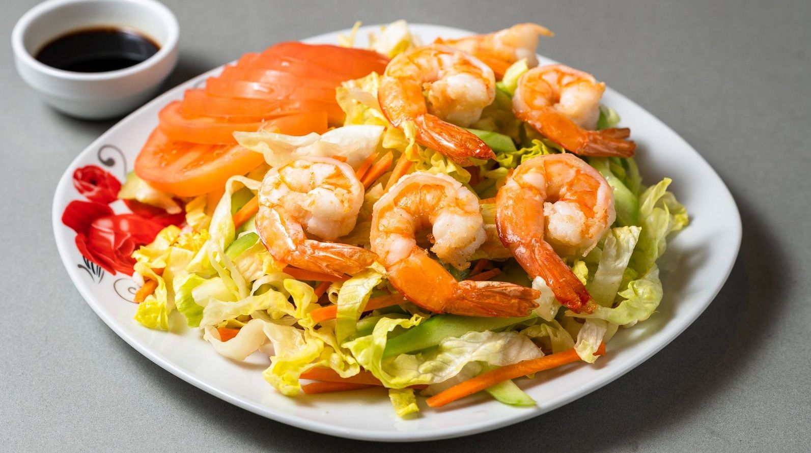 Σαλάτα με μαρούλι iceberg, αγγούρι, φύτρες φασολιών, γαρίδες και ντομάτα. Συνοδεύεται από σόγια σως